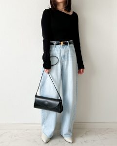 黒トップス×淡いデニム。定番コーデをオシャレ感を出しているの…