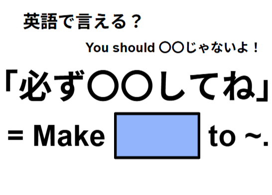 「必ず〇〇してね」「〇〇するの忘れないでね」は「Make sure to ~.」もしくは「Be sure to ~.」を使うことが多いです。