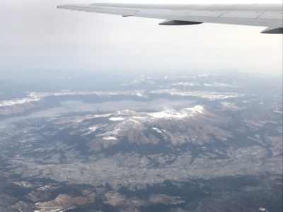 写真は雪化粧をした阿蘇山です。熊本市内で雪が降っていない日でも阿蘇山が白くなっていることはよくあり、通勤道からよく見かけます。阿蘇山は特徴的なカルデラ地形で、中央の阿蘇五山と外輪山の標高が高い形状をしています。そのため、降雪の阿蘇を上空から見ると、中央とそのまわりがドーナツ状に白くなる珍しい自然の景色に出会うことが出来ます。阿蘇ならではの冬の風景ですね。
