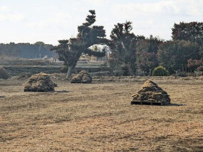 恐縮ながら密かに好評の「再春館製薬所への通勤道シリーズ」は、以前にもお話したことがある「芝生の畑」の現在の状態です。毎年寒さのピークの時季に「山積みの芝」を目にします。いわば芝の苗です。この苗を張った農地が一面、気候が暖かくなると成長して緑の芝になります。芝畑は育つと本当に壮観としか言いようがない美しさで、ゴルフ場のグリーンみたいです。緑になった芝を目にすると「あの山積みの芝がしっかり育ったんだな」と感慨深くなります。
