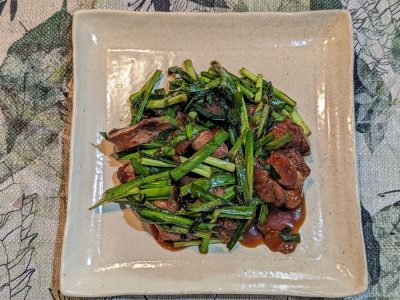 作り方は、鶏レバーは血の塊が取り除いて流水で洗い、水をきって3cm大に切り、しょうゆ(大さじ1)・オイスターソース(大さじ1)・おろし生姜(小さじ1)を合せて、揉み込むように下味をつけます。ニラは5~10cmの長さに切ります。