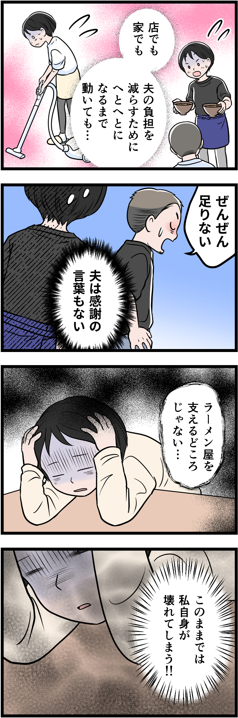 「夫のラーメン屋を支えるどころか、私は疲労で自分の生活すら支えきれなくなってきました。このままでは、自分自身が壊れてしまう、その恐怖が日増しに大きくなっていったのです」