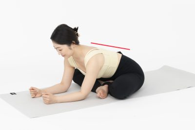 腕を遠くに伸ばせるほどになったら、さらに伸びを感じるためにひじから手首までを床につけて上体を前に倒します。