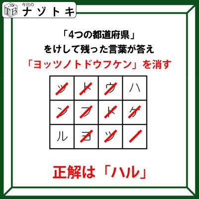 たしかにこのマス目のカタカナを見てみると確かに「ヨッツノトドウフケン」の文字がそれぞれ存在していることがわかります。よって、それらの文字を消してみましょう。すると上図のようになり「ル」「ハ」の二文字が残ります。あとは言葉になるように並べ替えると「ハル(春)」となります。正解は「ハル(春)」でした。