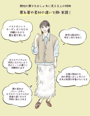 さて、取り入れている洋服が無地なのに洗練されて見える人は何が違うか。それは“レイヤード”を採用していることが多いです。例えば、丈の長いアイテムと丈の短いアイテムを組み合わせて、生地に段差を作る。薄手のTシャツに、やや厚みのあるジレを合わせて、服の質感を重ね合わせる。この他、配色にグラデーションを作るなども良いですね。同じ無地でも、計算してコーディネートをしているんだということが一目で分かるような工夫が凝らされていると見る人におしゃな印象を与えられます。