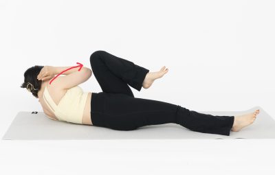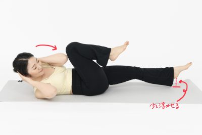 左わき腹をねじり、右ひざを左肘に寄せてタッチ。視線はおへそのあたりへ向けて肩甲骨のあたりまで床から浮かせます。わき腹を潰すイメージでひねって。