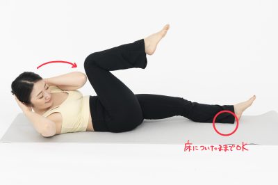 秋元さんは、トレーニング初挑戦で腹筋もできませんでした。できないことを無理にするのではなく、できることからはじめるために、肘とひざを対角線上でタッチする「バイシクルクランチ」の簡易バージョンからトライすることに。