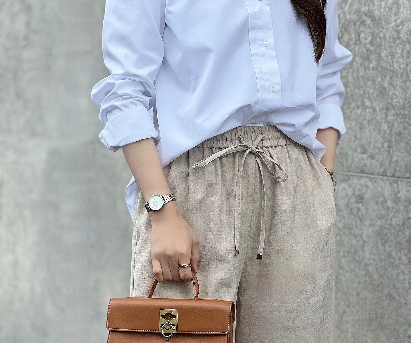 白シャツの爽やかさとリネンの軽やかさがちょうどよく、リラックス感がありながらもきちんと見える絶妙なバランス。