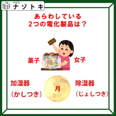 最後にそれぞれに「つき」をつけてみましょう。「菓子」と「月」は「かしつき(加湿器)」となります。そして「女子」と「月」なので「じょしつき(除湿器)」となりますね。正解は「加湿器」と「除湿器」でした。