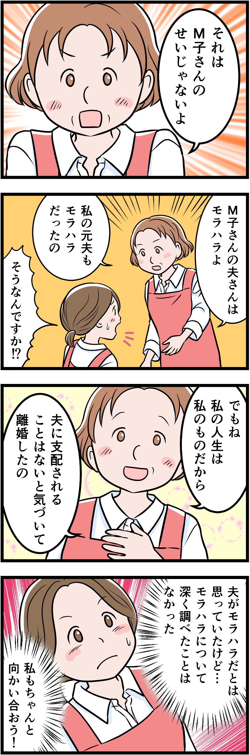 本編では、夫のモラハラに悩むM子さんが、パート先の先輩の言葉をきっかけに、自分の状況を見つめ直す姿をお届けしました。