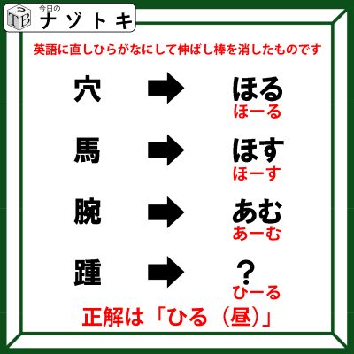 これらの言葉の共通点を考えてみましょう。それは3文字かつ2文字目が伸ばし棒であるとういことです。そして、矢印の右側を見てみるとその伸ばし棒を消した言葉だということがわかります。つまり、今回の法則は「英語に直し伸ばし棒を消す」ということなのですね。