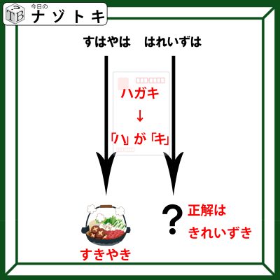 これは、上の言葉の文字の「ハ」が「キ」に変化させるという法則でした。確かに「すはやは」から「すきやき」に変わるということはハがキに変わっていますね。