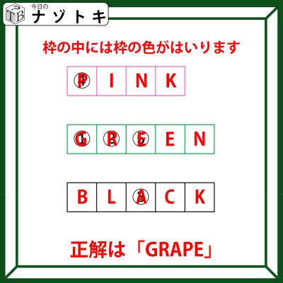 それはこの枠の色がポイントでした。上がピンク、真ん中が緑、下が黒ですね。この枠内にはその色を英語にしたものがはいります。そうすると枠内にぴったりとあてはまります。つまり、上から「PINK」「GREEN」「BLACK」となりますね。