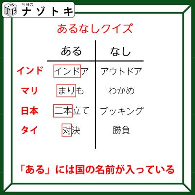 それは国名です。「ある」にある方は最初の数文字が国名になっています。「インドア」は「インド」、「まりも」は「マリ」、「二本立て」は「日本」、「対決」は「タイ」ですね。