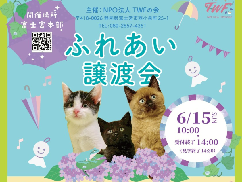 6月15日(日)、さやかさんが参加する保護団体「NPO法人 TWFの会」富士宮本部で譲渡会が開催されます。