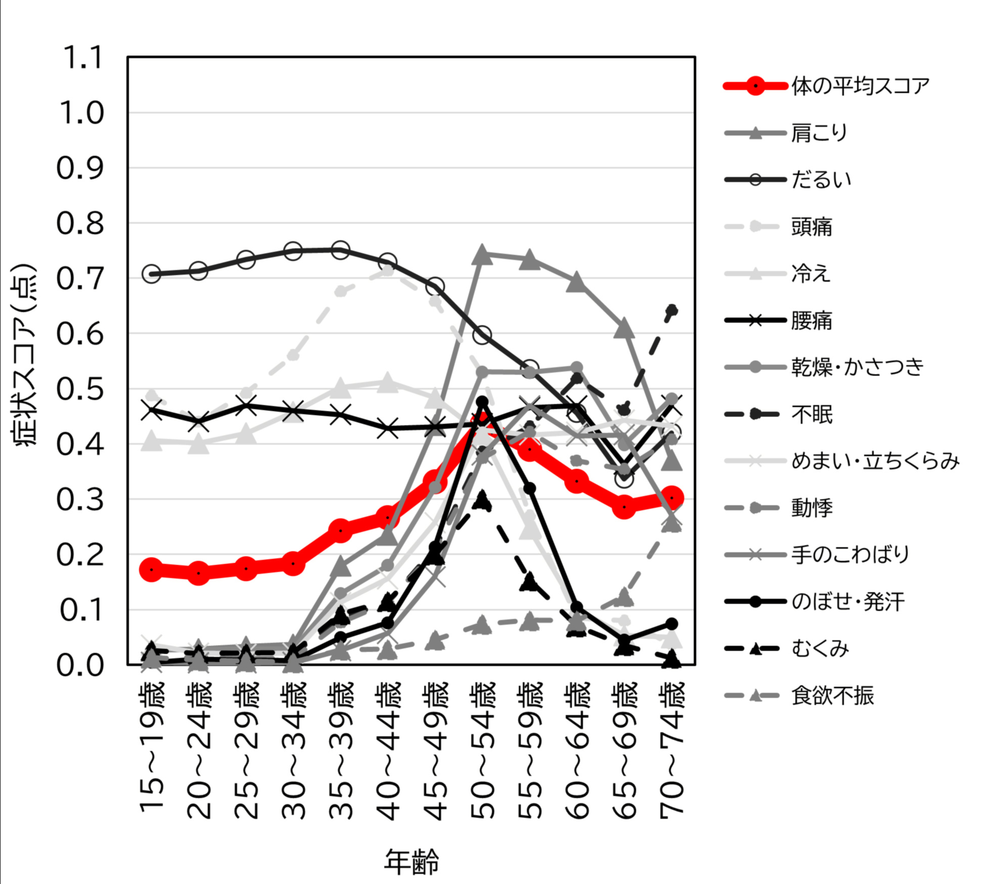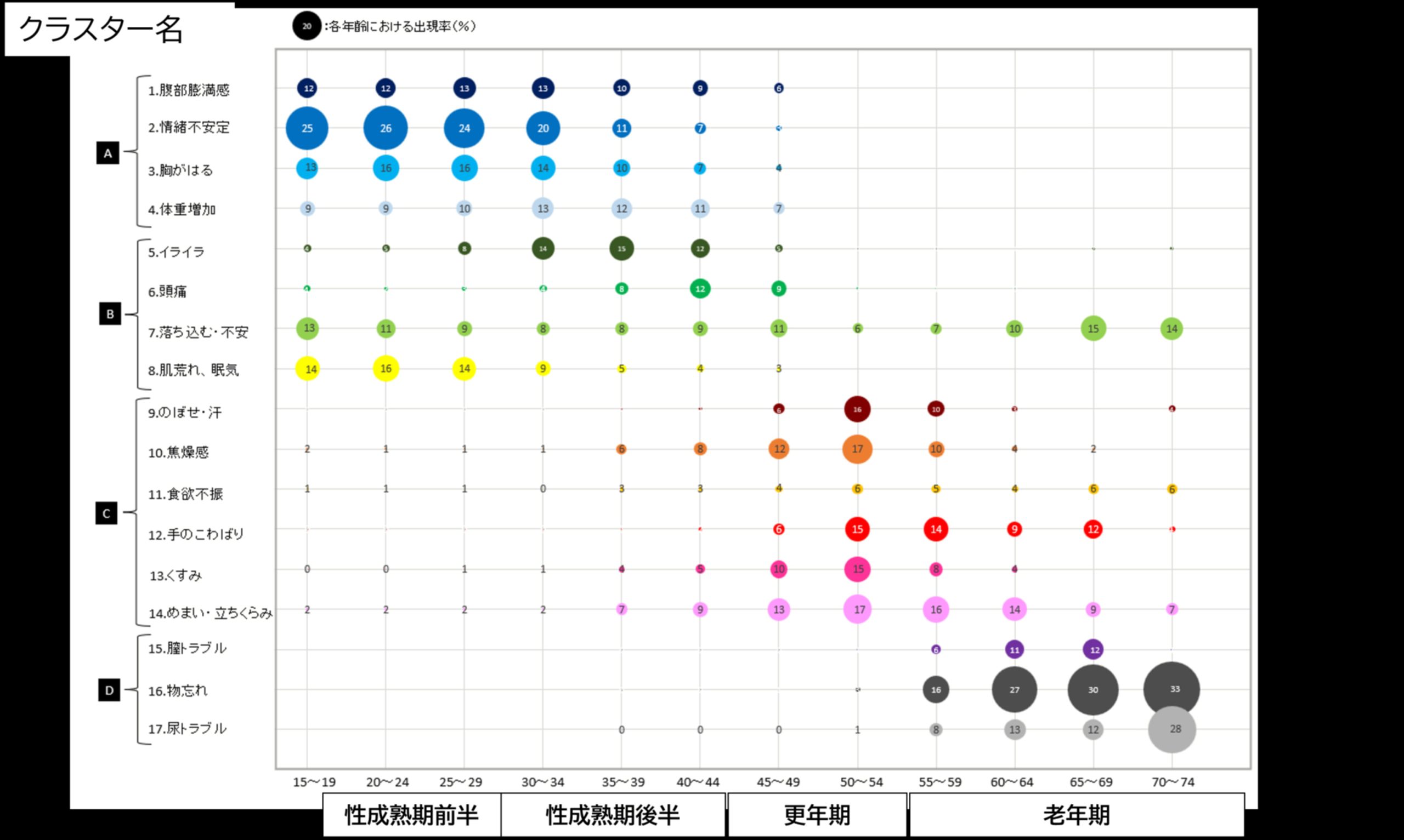 【画像】命の母AI「10~70代女性のライフステージ別愁訴の変化 ―7万人のデータ解析に基づく横断的検討―」 2025.06.09 WELLNESS 画像ギャラリー クリックで拡大・図1「各クラスターにおける年齢層別の出現率の分布図」※1:円の大きさが出現率をあらわす。各クラスターのなかで特徴的な症状をクラスター名として命名 心の症状スコアの年齢による変化 体の症状スコアの年齢による変化 スポンサーリンク 【注目の記事】 1番対策が難しかった…!頬のたるみやほうれい線につながるNG食事習慣最後のひとつ 冬の寒さに負けない!そろそろ準備したい中綿アウター×【ユニクロ】バズりデニムの着こなし【40代の毎日コーデ】 【ユニクロ】カシミヤタッチニットで魅せる!旬のブラウンを効かせた洗練肩掛けテク【40代の毎日コーデ】 東大生が注意喚起!「鵜呑みにしてはいけない」SNSで「でたらめの受験情報」を発信する人の特徴とは 「東大受験が簡単!?」な難関私立高出身者。天才たちの受験勉強、その驚きの実態とは この記事は OTONA SALONE編集長 井一美穂 スポンサーリンク スポンサーリンク 【井一美穂の記事一覧】 インフルエンザ大流行をどう「食べて予防」する?小雪の頃、気のめぐりをよくしてくれる黄色くて小さい食べ物の名前とは 熟年離婚する予定なら?あと10年ないけど老後資金って何とかなる?「60代からの私のためのお金の話」人生100年時代を安心して歩むために 「インフルエンザが大流行する」とき食べておきたい3つの食材とは?1つは「あの肉」 >>もっと見る