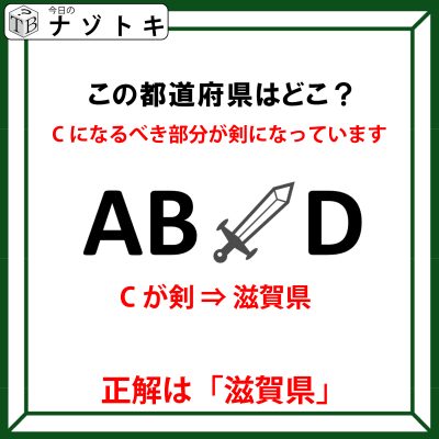 これは本来Cの部分が剣になっている。Cが剣、シーが剣、しがけん、滋賀県!ということで正解は滋賀県でした。