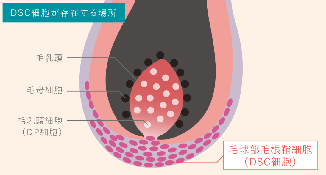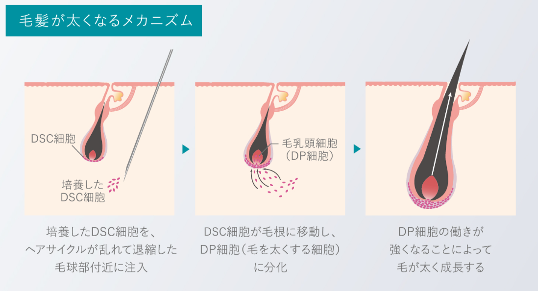 DSC細胞(Dermal Sheath Cup)、すなわち「毛球部毛根鞘細胞」とは、「毛乳頭細胞になる前駆体」だと考えられています。このDSC細胞を外部で培養し、毛根部近くに注入することで毛乳頭細胞を増やすアプローチを行う、この新たな治療方法が「S-DSC毛髪再生医療」なのです。