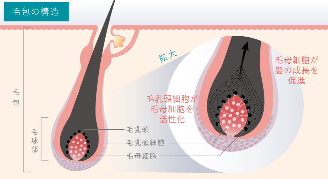 上図は毛髪が「生まれる」仕組みです。髪の根元、毛球部で毛乳頭細胞が毛母細胞を活性化することで、毛母細胞が髪の成長を促進します。