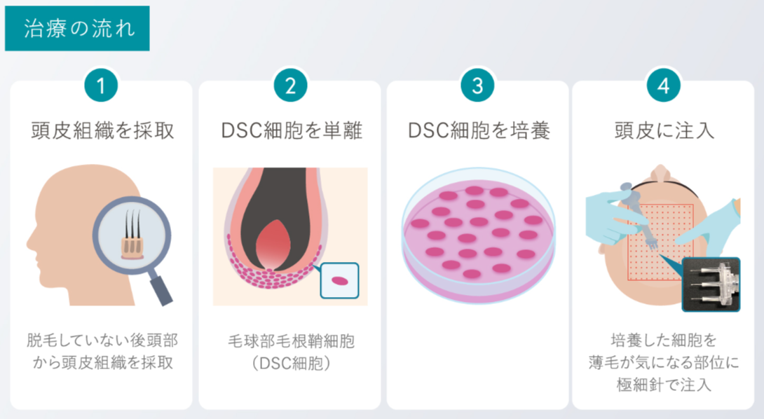 ここで冒頭の「再生医療」に話を戻します。すでに脂肪組織や間葉系に由来する幹細胞の直接移植、またそれらの分泌物を含む培養上清液、あるいはPRP(自己多血小板血漿Platelet Rich Plasma)を薄毛部位に注入する治療は存在していましたが、今回新たに見出されたのは自分自身が持つ「DSC細胞」を採取し培養、注射で頭皮に注入するという方法です。