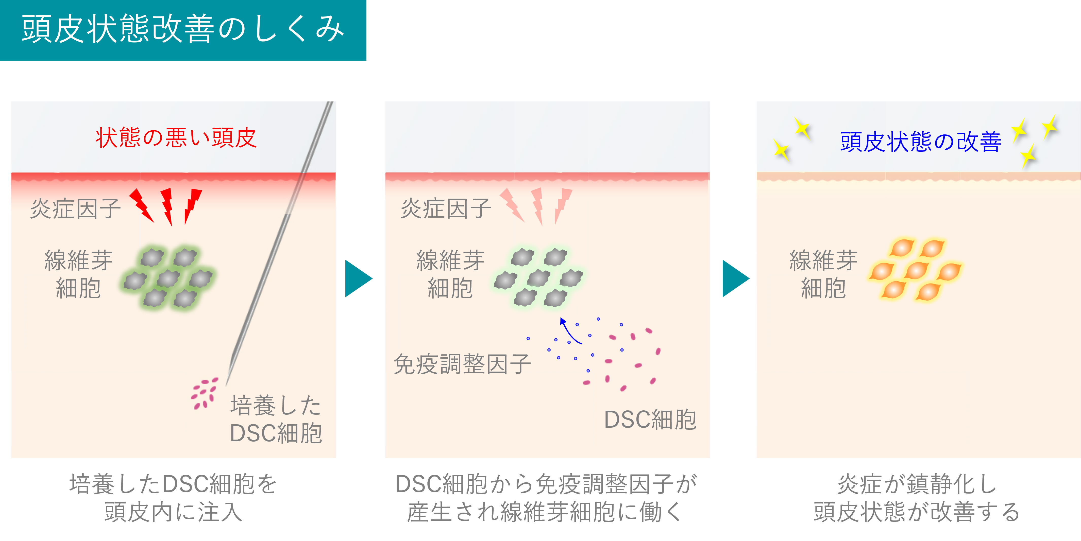 資生堂との研究においても、DSC細胞は抗炎症効果を持つことがわかってきています。頭皮に注入されたDSC細胞から産生される免疫調整因子が炎症を鎮静化し、頭皮状態を改善させると考えられているのだそう。