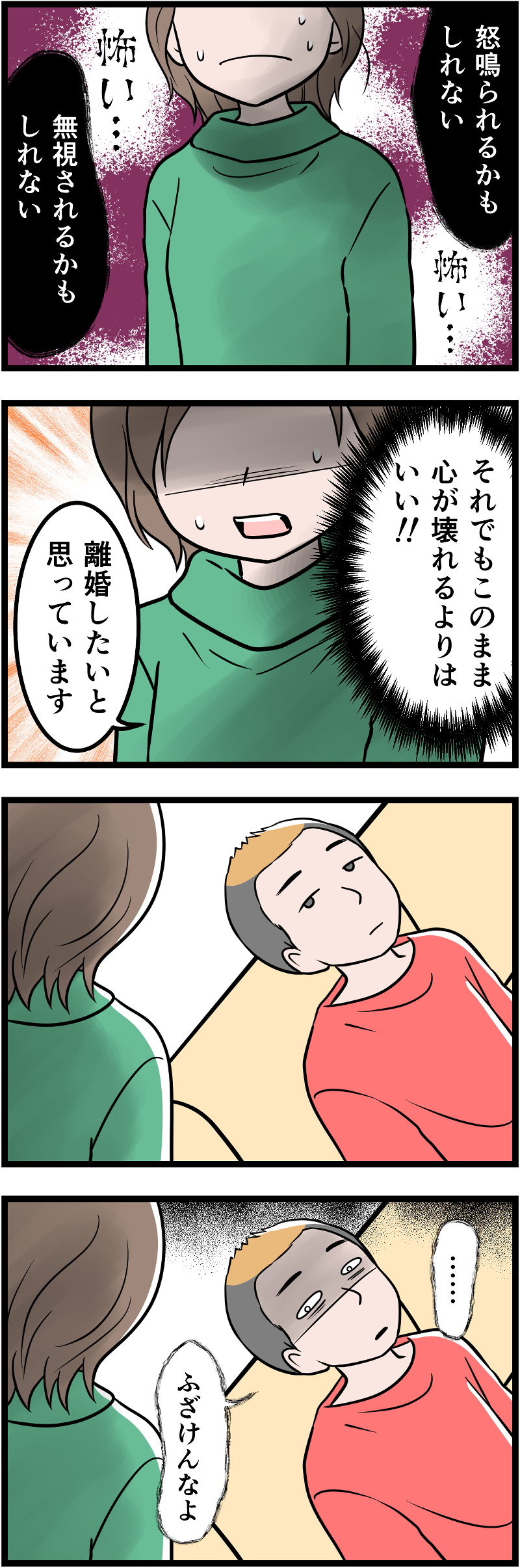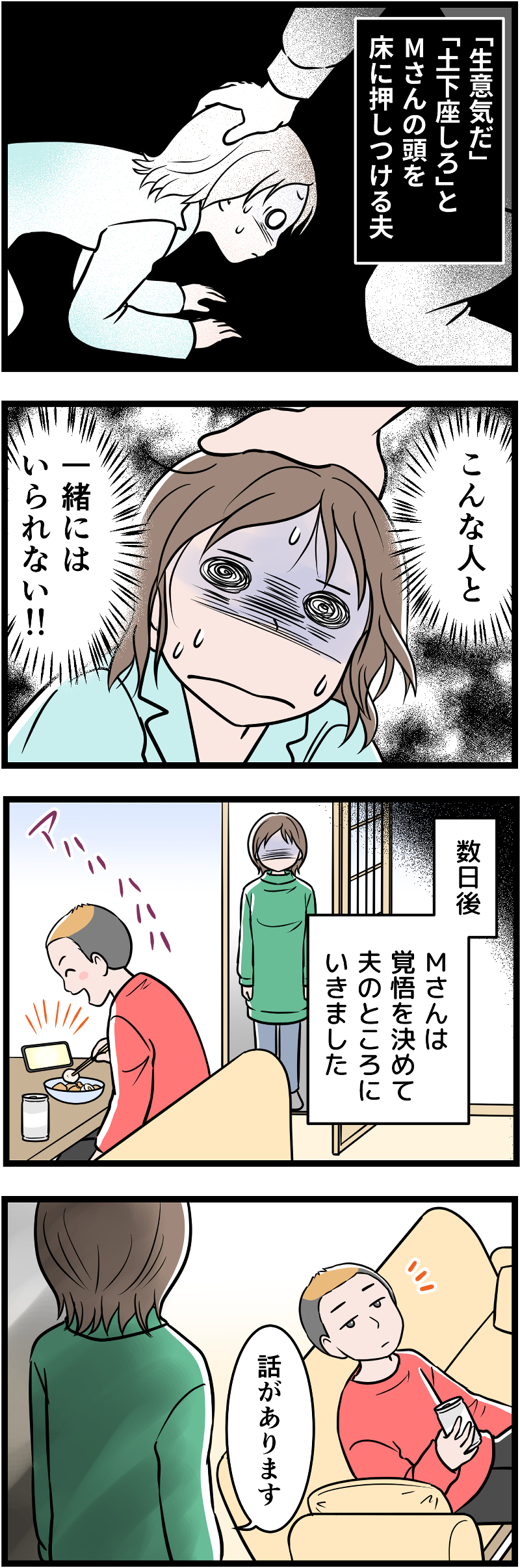 土下座をさせられるという衝撃的な体験。あまりに支配的で暴力的で……こんな人とは、もう一緒にいられない。数日後、M子さんは、覚悟を決めて夫に話しかけることにしました。