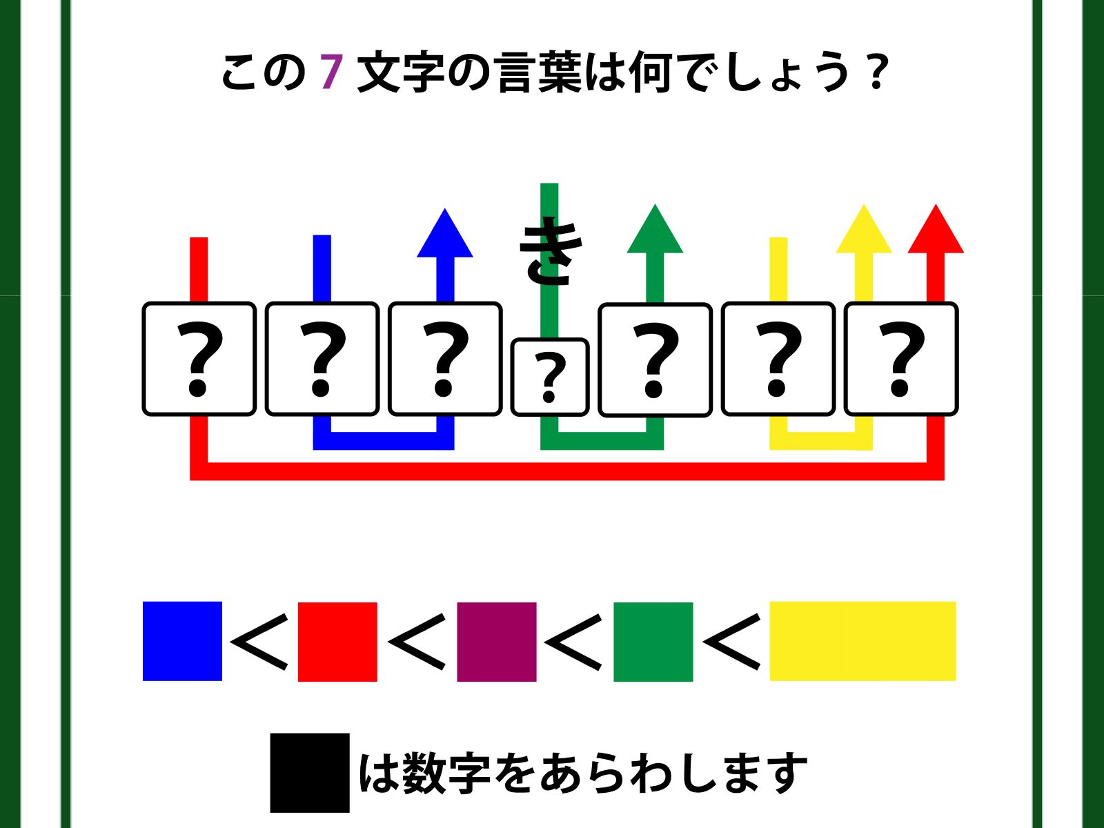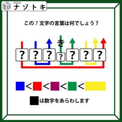 クイズです!「この7文字の言葉は何でしょう?」色付きの四角と矢印がポイント【難易度LV4.・辛口】