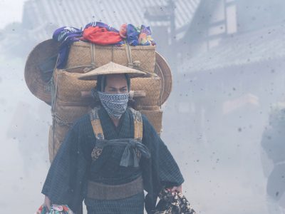 蔦重が日本橋進出にむけて準備を進めている中、浅間山の大噴火で江戸市中にも灰が降り積もる事態に。蔦重は自身の店となった丸屋の樋や瓦の隙間に灰が詰まらぬよう布を敷くため、大量の布切れを背負い、店先に現れました。