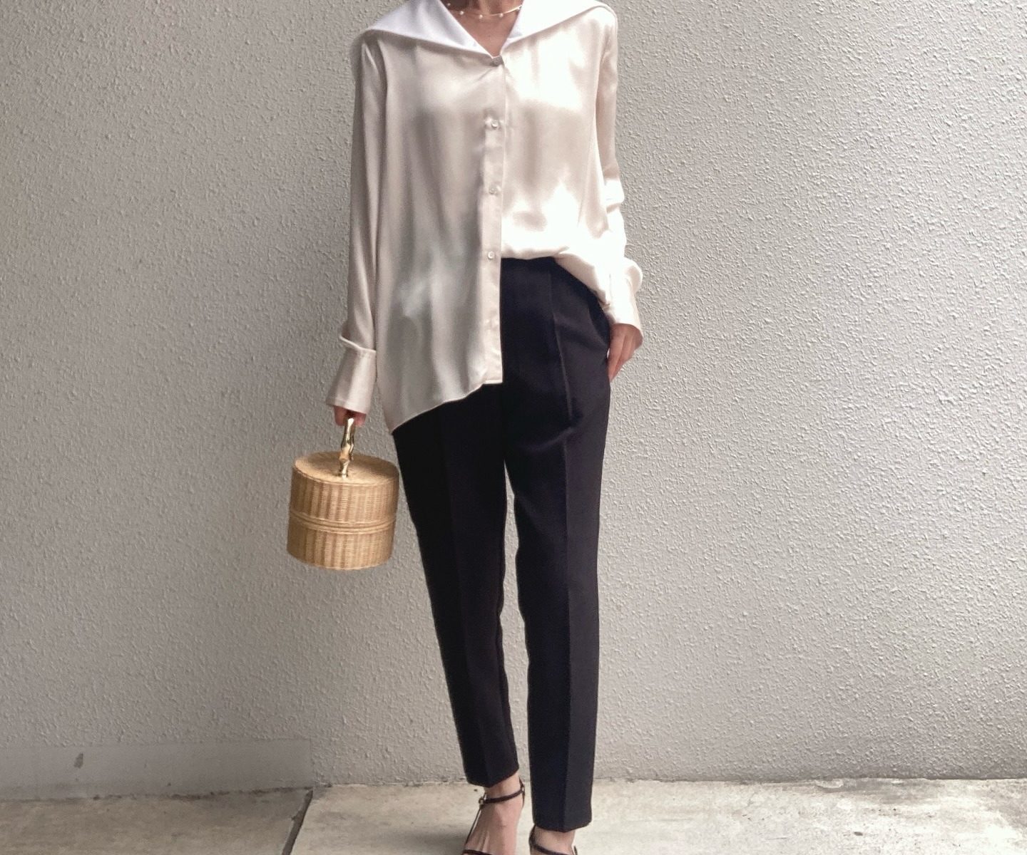 とろみ感のあるセーラーカラーデザインの光沢ブラウスに、濃紺のテーパードパンツを合わせた、かわいらしさとエレガントさが兼ね備わった着こなしがこちら。