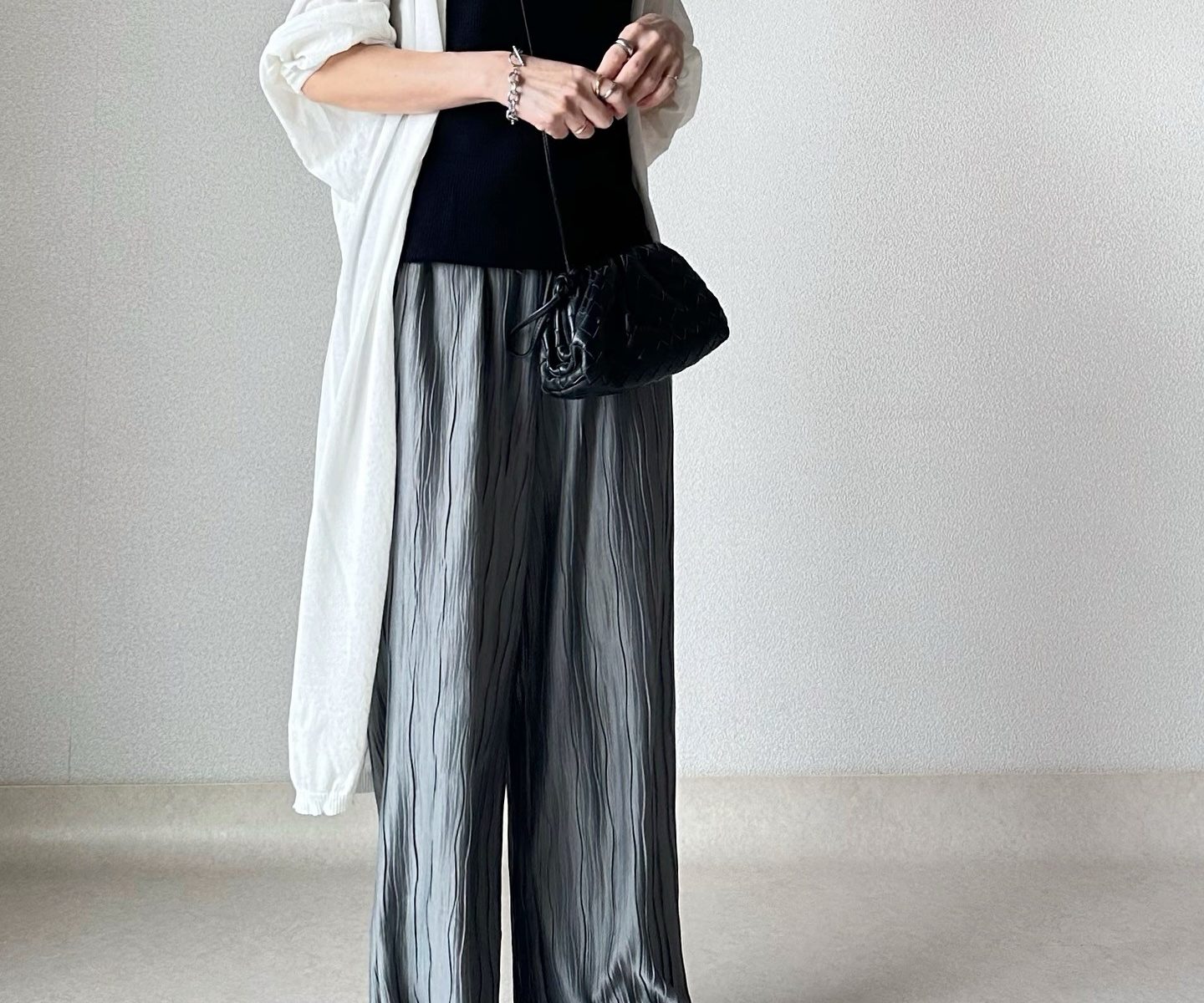 さらっと羽織れるロングカーディガンに、凹凸感のあるウェーブプリーツパンツを合わせた夏のリラックスコーデ。
