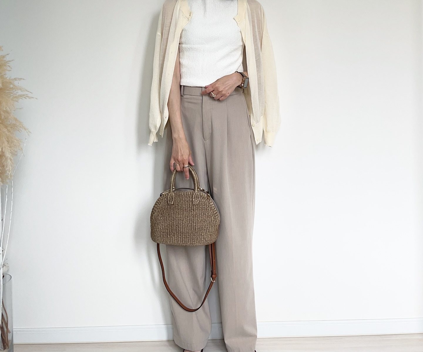 足元は濃いめカラーのパンプスで全体を引き締め、バッグはナチュラル素材で季節感を添えて。カラーをベージュ系で統一しながら、異なる素材で奥行きを出すことでシンプルすぎずこなれた印象に。