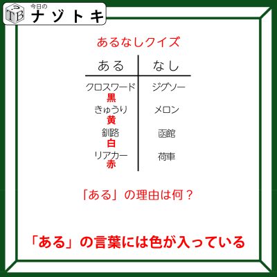 それは色です。上から「クロスワード(黒)」「きゅうり(黄)」「釧路(白)」「リアカー(赤)」です。確かに色が含まれていますね。