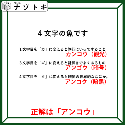 クイズです!「4文字の魚になるそうです」一文字ずつ変えてできる言葉から連想すると……【難易度LV3.・中辛】
