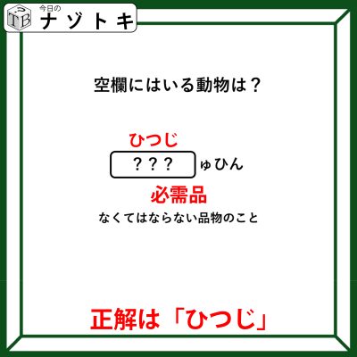 当てはまるのは「必需品」という言葉です。これをひらがなにしてみると「ひつじゅひん」ですね。これをよく見てみましょう!「ひつじ(羊)」が隠れていますよね!というわけで正解は「ひつじ(羊)」でした。
