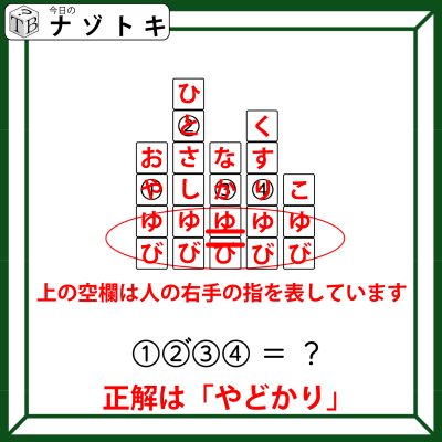 あとは数字の部分を拾って答えを出していきましょう。正解は「やどかり」でした。