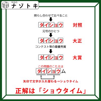 問題の空欄にも「たいしょう」を埋めてみましょう。その後に下の矢印にしたがって「タイ」と「ショウ」を入れ替えてよんでみましょう。それが答えになります。正解は「ショウタイム」でした。