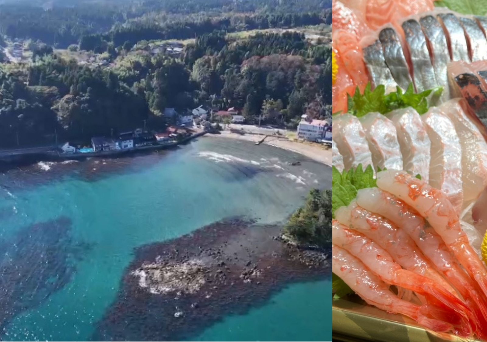 ※TOP/写真左:能登半島・内浦にある恋路海岸、右:したひら鮮魚店(宇出津)の刺盛り