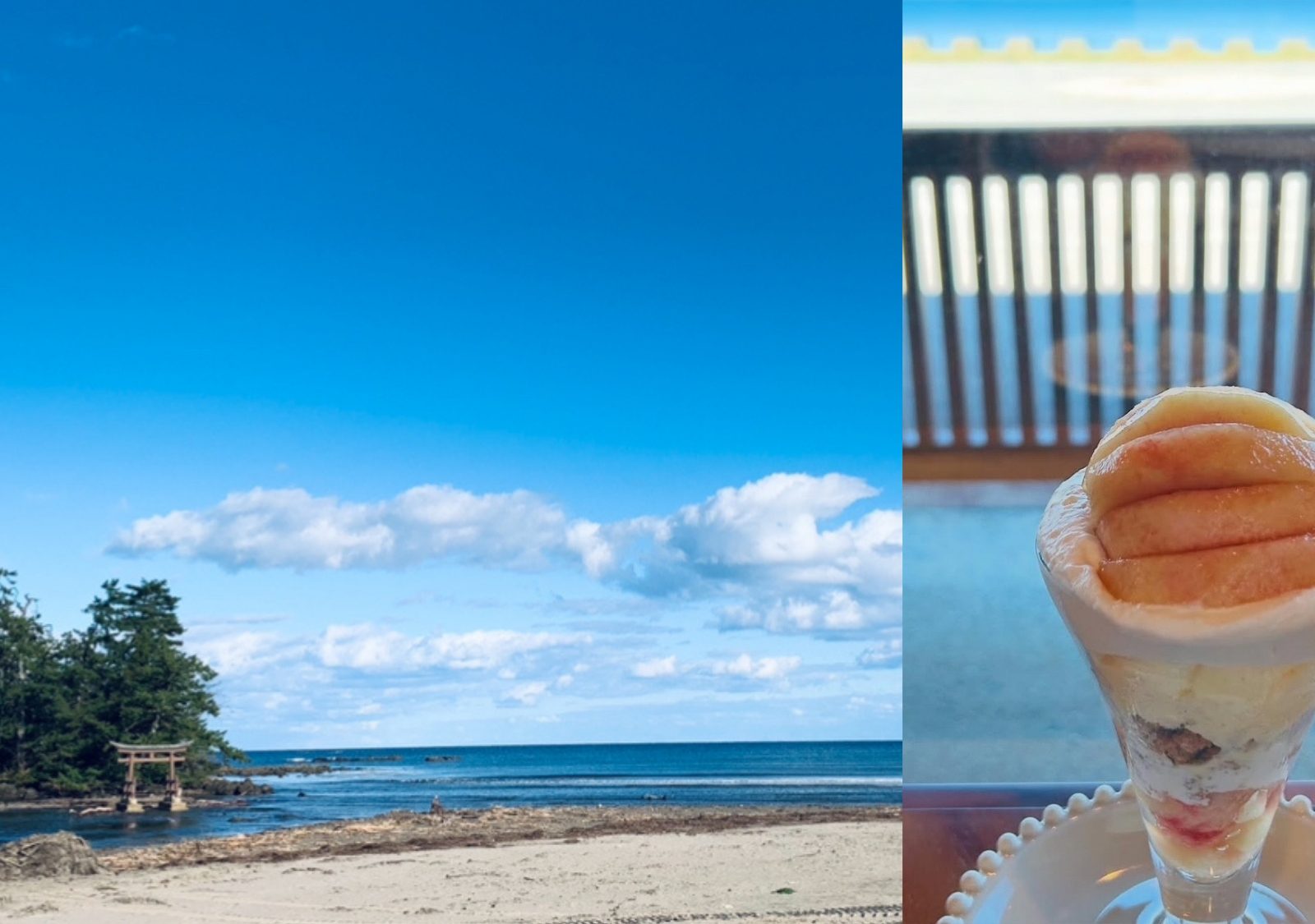 ※写真左:恋路海岸 /右:桃のパルフェ(ミモザの余韻)