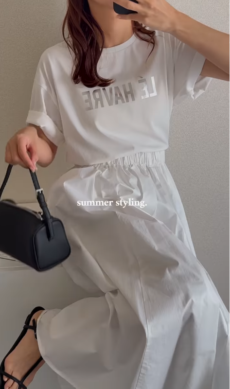 カジュアルな白ロゴTも、ふんわりとした光沢感のあるボトムスと合わせれば上品な印象に。長方形のミニバッグと華奢なサンダルで、女性らしいエッセンスをプラス。色で魅せる、シンプルなのに印象に残るモノトーンコーデです。ワントーンだからこそ、シルエットや素材感で差をつけて。