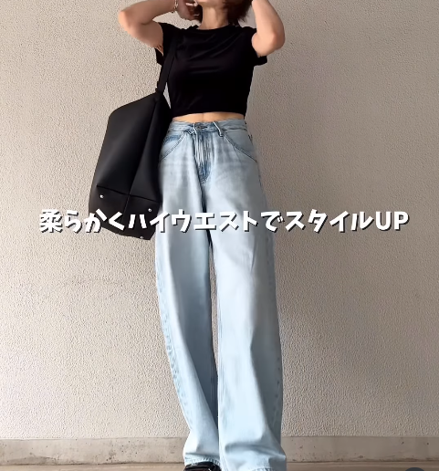 GU「シアーベロアミニT+X」1290円(166㎝・Mサイズ着用)のブラックに、ユニクロ「バギーカーブジーンズ」4990円(166cm・25インチ着用)を合わせた、抜け感たっぷりの夏コーデです。