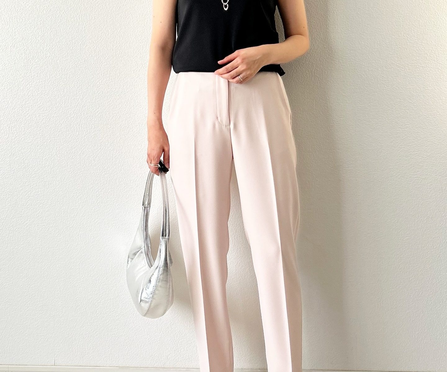 淡いピンクのストレートパンツに黒トップスを合わせた、配色とシルエットのバランスが絶妙なきれいめコーデです。