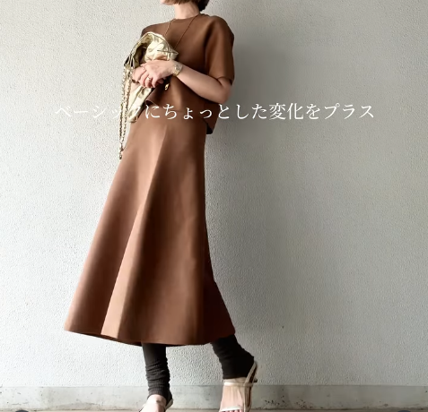 ブラウンのまろやかカラーは、肌なじみも良くて大人の女性におすすめ。足元にはトングサンダルとレギンス感覚のウォーマーを合わせて、少しだけスパイスをプラス。甘さを抑えてこなれた印象に仕上げています。