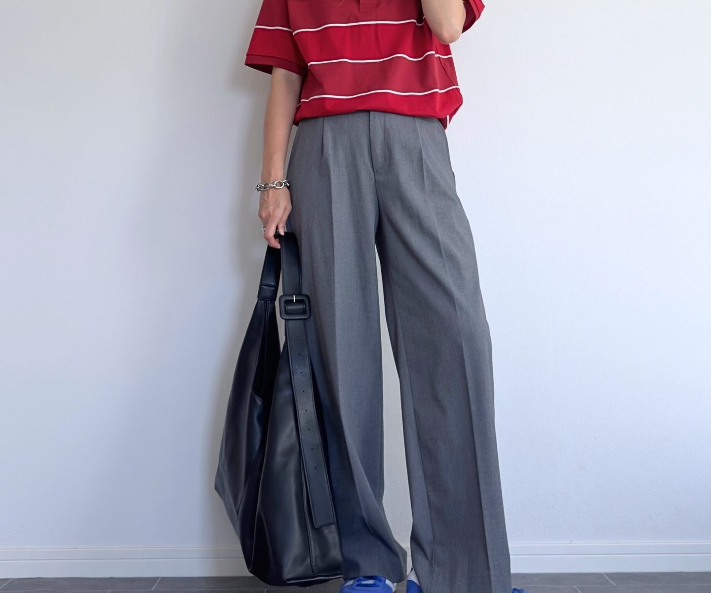 ユニクロの「ドライカノコポロシャツ」2,990円(166cmでサイズM着用)は、赤の発色がコーデ全体の印象を明るくしてくれる主役級アイテム。ボーイッシュになりがちなボーダー柄も、グレーパンツと合わせることで一気に大人バランスに。