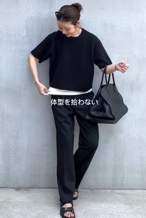全体を黒でまとめながら、裾からちらりとのぞく白インナーがコーデに軽さと抜け感をプラス。パンツもほどよくワイドでリラクシーな雰囲気がありながら、センタープレス風のデザインでだらしなく見えないのがポイント。