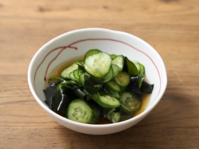 ボウルに[1]のきゅうりとわかめを入れ、<合わせ酢>を加え、よくあえて味をなじませる。