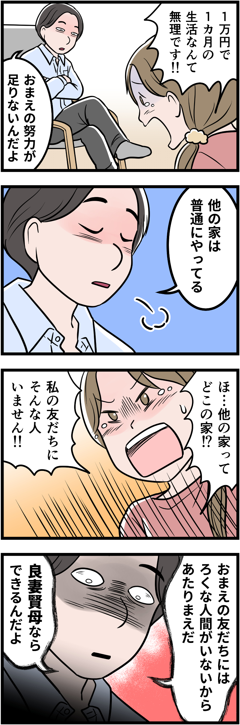 深夜にまた正座させられて…「お前の周りが異常なんだ!」経済DV夫の本性がついに牙を剥いた【モラハラ実話マンガ】#64 2025.08.08 LIFE 離婚体験記女性の生き方モラハラマンガうちの夫はモラハラでした 次回、8月15日 21時半 更新です。 <<前のページ <<Tさんの話を1話目から読む *このシリーズをイッキ読み!* 凪さんのモラハラマンガ連載が、電子書籍になりました! 『わたしがモラハラ夫を捨てて離婚するまで ~後悔! 彼のモラハラ体質を見抜けなかった編~』(凪 著/主婦の友社刊) この作品のAmazonレビューを見る 楽天KOBOでこの作品をチェック 書影をクリック! Amazon なら無料で読めます。 1 2 スポンサーリンク 【注目の記事】 1番対策が難しかった…!頬のたるみやほうれい線につながるNG食事習慣最後のひとつ 冬の寒さに負けない!そろそろ準備したい中綿アウター×【ユニクロ】バズりデニムの着こなし【40代の毎日コーデ】 【ユニクロ】カシミヤタッチニットで魅せる!旬のブラウンを効かせた洗練肩掛けテク【40代の毎日コーデ】 東大生が注意喚起!「鵜呑みにしてはいけない」SNSで「でたらめの受験情報」を発信する人の特徴とは 「東大受験が簡単!?」な難関私立高出身者。天才たちの受験勉強、その驚きの実態とは この記事は マンガ家・イラストレーター 凪 スポンサーリンク スポンサーリンク 【人気の関連記事】 【おひとりさま】 なぜか40代独身がすすめられる、幸せのための15のこと 【あるある】 世間というものは40代未婚のおひとりさまの行く末を心配してくださるのか、いろいろなものをすすめられます。独女の幸せを考えて、親族から、友人から、知人から、先輩から… 40代。もう私、いつ死んだっていい気がするけど | あした死ぬには、#1 突然の病気。更年期障害。取れない疲労、お金の不安、これからの人生の迷い……。40代がぶち当たる「壁」をあまりにもリアルに描き出し、熱く静かな共感をさらった雁須磨子さ… 【独女】おひとりさまを楽しむ! 40代・独身・未婚の女性有名人【元アイドル・芸人まとめ】 40代で独身、結婚歴のない元アイドルの女性、女芸人をピックアップ! みなさん40代とは思えない美貌をキープしていたり、独女ライフを楽しく送っていそうな女性たちばかり… 【凪の記事一覧】 まるで別人のような父にびっくり…。この変化は私のせいなの?【モラハラ実話マンガ】#108 支配され続ける私にさようなら。そして、ついに父と対決する日が来た【モラハラ実話マンガ】#107 【実話】「ゾッとする…」自分の本心に気づいてしまった。モラ夫の顔色をうかがい続ける日々には、もう「うんざり」! >>もっと見る