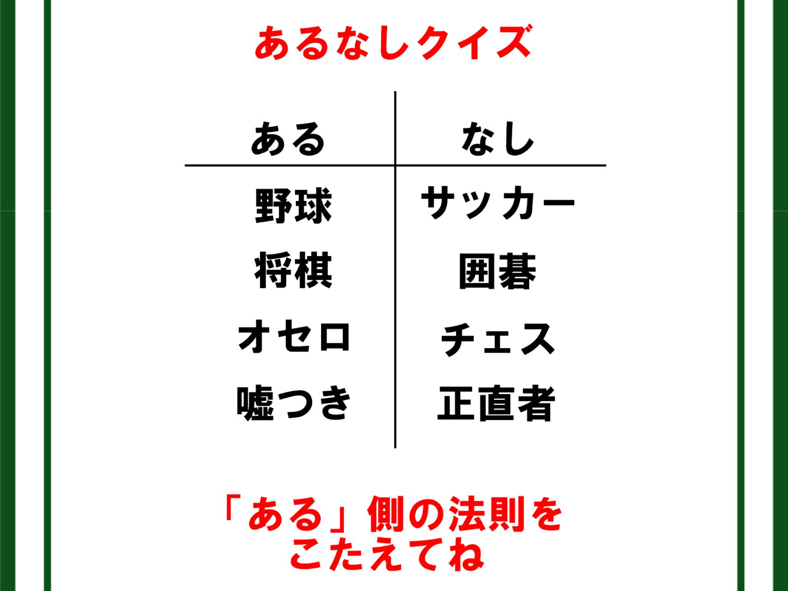 「ある」側の法則を考えるあるなしクイズです。
