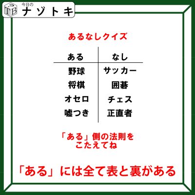 あるなしクイズです!「野球にあってサッカーにない」「嘘つきにあって正直者にない」それはなに?【難易度LV3.・中辛】
