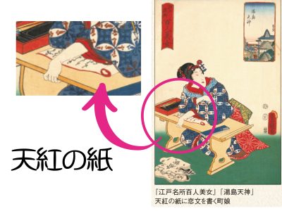 さらに安政年間に描かれた歌川豊国の『江戸名所百人美女』に登場する「湯島天神」では、年若い町娘が恋文を書くのにも天紅の巻紙を使っていますから、かなり流行したようです。