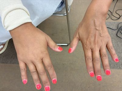 メイクをしていただく最中に撮った写真ですが、見て、リンパ浮腫がすごくて。リンパ節切除をした右の手がパンパンなんです。放射線療法のしんどさとリンパ浮腫のつらさはあまり語られていないなと感じますが、これもがんの闘病にまつわるひとつの姿です。